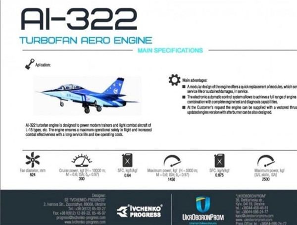 AI-322發(fā)動機由烏克蘭“伊芙琴科-進步”設(shè)計局研發(fā),由馬達西奇公司制造,這臺發(fā)動機就是原來的AI-222-25發(fā)動機的改進型,是一種無加力的中小推力小涵道比渦扇發(fā)動機,它的無加力推力是2.5噸。AI-322還有一個帶有加力燃燒室的型號,叫AI-322F,加力推力達到4.2噸,是為L-15的領(lǐng)先戰(zhàn)斗訓(xùn)練型L-15B研發(fā)的,L-15B具備1.4馬赫的超音速飛行能力,可以承擔(dān)輕型戰(zhàn)斗機的部分功能。